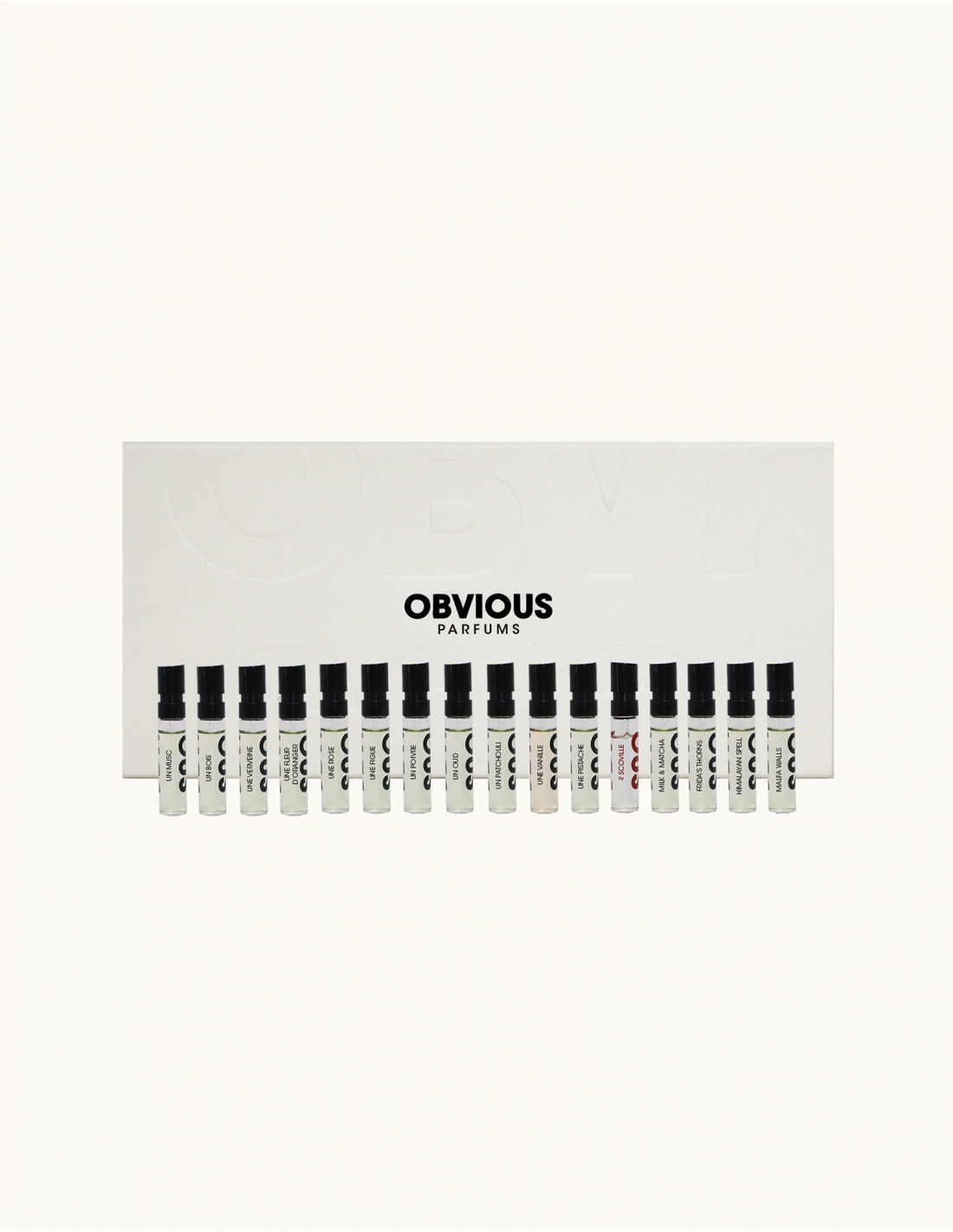 - 16 campioni di profumo da 1,5ml: Un Musc, Un Bois, Une Verveine, Une Fleur d'Oranger, Une Rose, Une Figue, Une Vanille, Une Pistache, MILK & MATCHA by OBVIOUS, SCOVILLE by OBVIOUS, Frida's Thorns, Himalayan Spell, Malfa Walls, Kakigori White Crush, Dulce de Leche, Plum Cream.